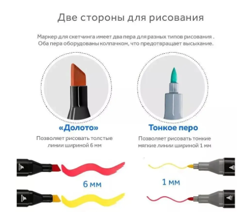 Маркеры для рисования удобно перевозить и хранить дома. Небольшой вес и компактная сумочка, идущая в комплекте, позволит Вам создавать шедевры там, где вы встретите вдохновение.