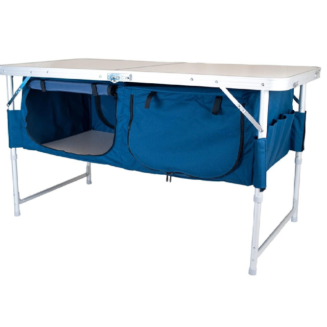 Стол тумба Ranger ТА-519 Rcase – это практически своя кухня на природе. Двухсекционная полка закрытого типа отлично подходит для хранения продуктов, посуды, одежды. Полка сделана из непромокаемого и очень прочной ткани. Каждая полка застёгивается молнией и имеет доступ с 2-х сторон, нет необходимости обходить стол, все под рукой всегда. Для плотности полки на дно укладывается пластины из пластика. По бокам есть ещё по три кармана для столовых приборов и других необходимых мелочей.