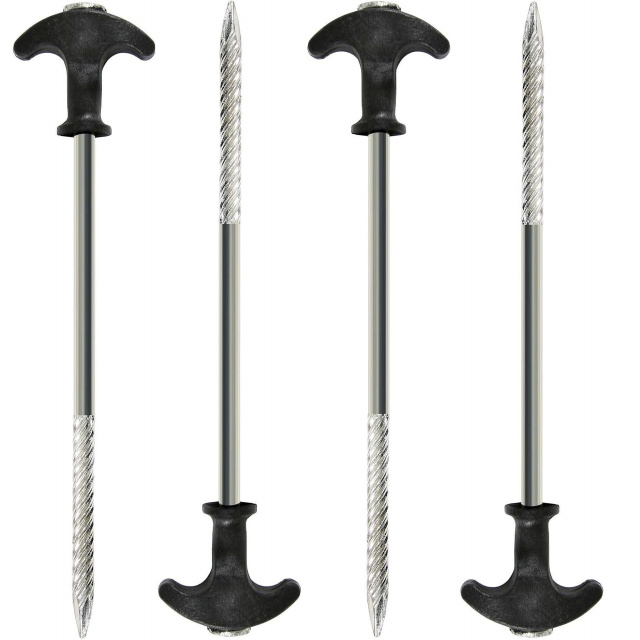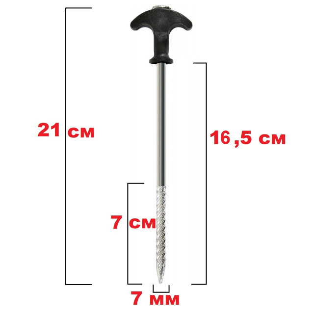 Комплект колочков с резьбой, для палаток и шелторов. В наборе входит 10 штук. Предназначены для надежного закрепления палатки, тента, зонта даже в самой твердой почве. Изготовлены из высококачественной стали и сверхпрочного пластика. Длина колышка: 21.5 см; Диаметр стержня: 7 мм; Длина рукоятки: 17,5 см; Длина резьбы: 8 см; Комплектуется удобным чехлом.