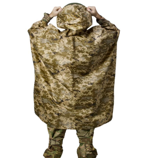 Изделие надежно защищает не только тело бойца, но и его экипировку и снаряжение, в том числе оружие, рюкзак и т.д. Благодаря широкому крою совершенно не сковывает движения, обеспечивает быстрый переход в позицию ведения огня. Представленный плащ-палатка имеет широкий глубокий капюшон, полностью покрывающий голову со шлемом. Для более комфортного использования на капюшоне предусмотрены прорезиненные жгуты с фиксаторами.