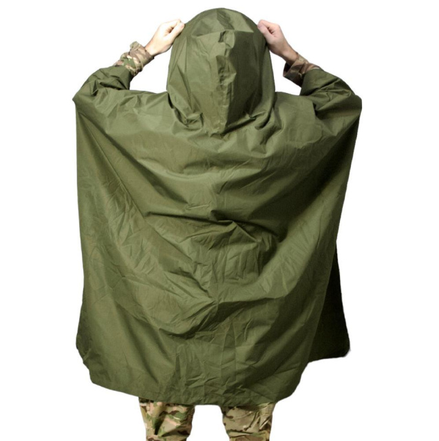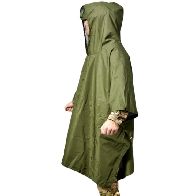 Изделие надежно защищает не только тело бойца, но и его экипировку и снаряжение, в том числе оружие, рюкзак и т.д. Благодаря широкому крою совершенно не сковывает движения, обеспечивает быстрый переход в позицию ведения огня. Представленный плащ-палатка имеет широкий глубокий капюшон, полностью покрывающий голову со шлемом. Для более комфортного использования на капюшоне предусмотрены прорезиненные жгуты с фиксаторами.