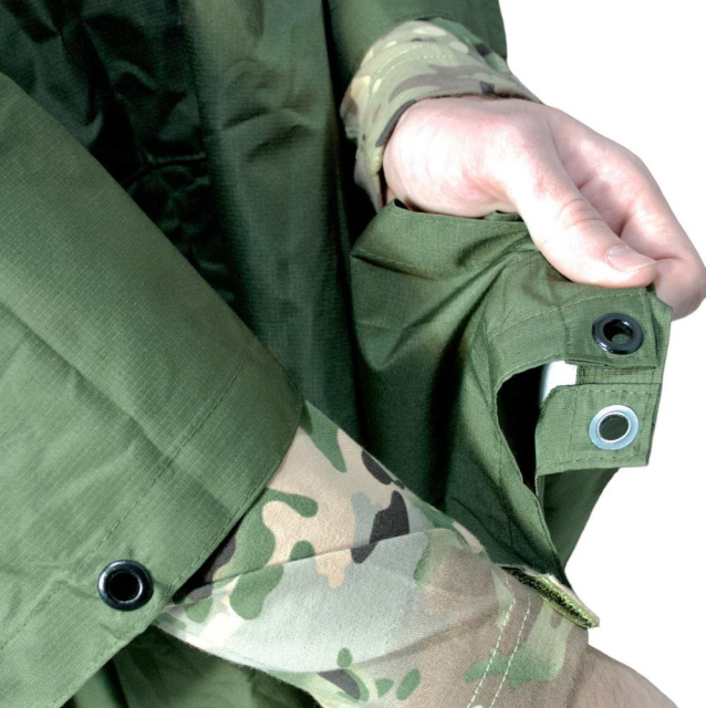 Дождевик имеет укрепленные люверсы на краях, поэтому его можно растянуть и сделать укрытие от солнца или дождя или использовать для транспортировки человека, получившего ранения.