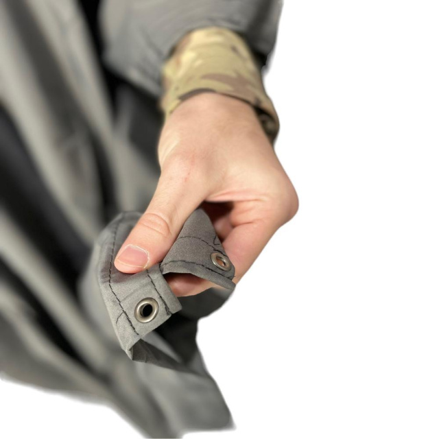 Дождевик имеет укрепленные люверсы на краях, поэтому его можно растянуть и сделать укрытие от солнца или дождя или использовать для транспортировки человека, получившего ранения.