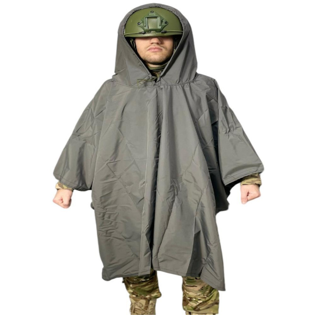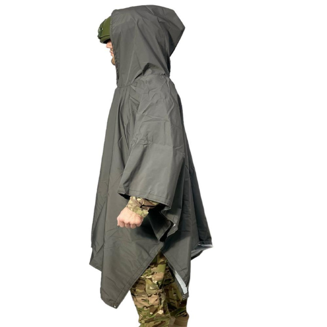 Изделие надежно защищает не только тело бойца, но и его экипировку и снаряжение, в том числе оружие, рюкзак и т.д. Благодаря широкому крою совершенно не сковывает движения, обеспечивает быстрый переход в позицию ведения огня. Представленный плащ-палатка имеет широкий глубокий капюшон, полностью покрывающий голову со шлемом. Для более комфортного использования на капюшоне предусмотрены прорезиненные жгуты с фиксаторами.