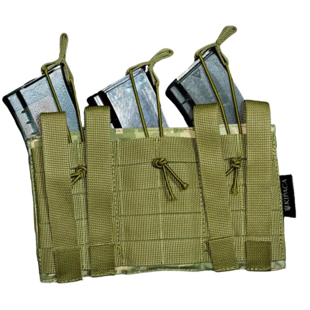 Предназначен для переноски на снаряжении в открытом виде 3-х автоматных магазинов. В этом подсумке можно надежно зафиксировать три рожка, которые не