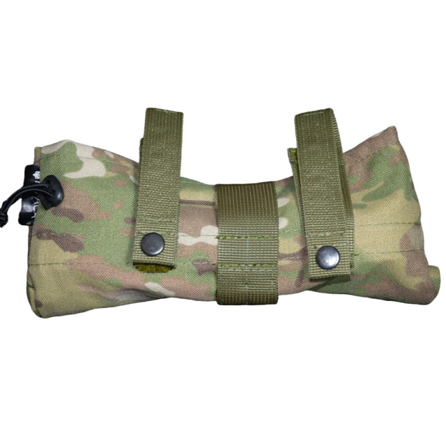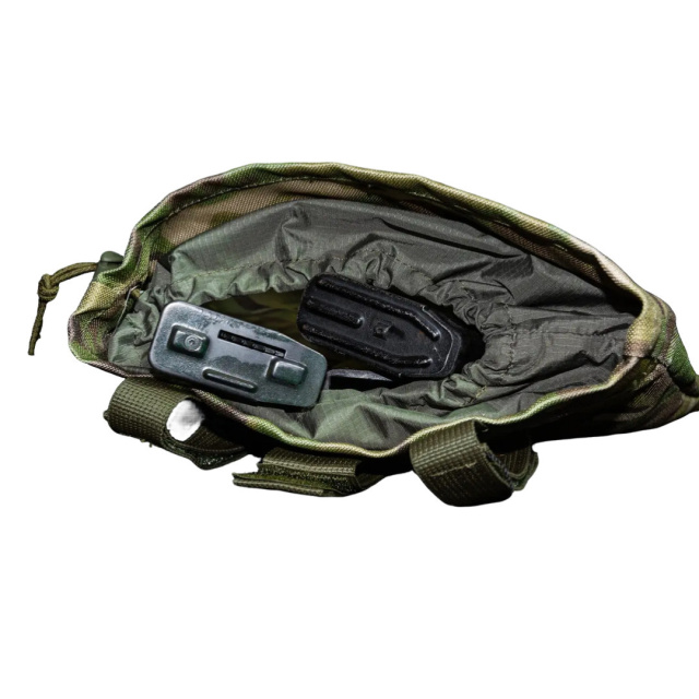 Крепится по пояс, бронежилету и рюкзаку с помощью ленты-липучки или на стропах с пряжками, изготовлен из плотного материала Cordura 1000. Присутствует альтернативная система крепления на пояс с помощью кнопок. Легкий, но крепкий водонепроницаемый клапан на резинке с фиксатором. Имеет рабочее положение и положение скручивания