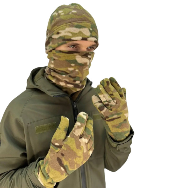 Тепла шапка та бафф з флісу щільністю 250 грм2, перчатки з флісу щільністю 280 грм2.