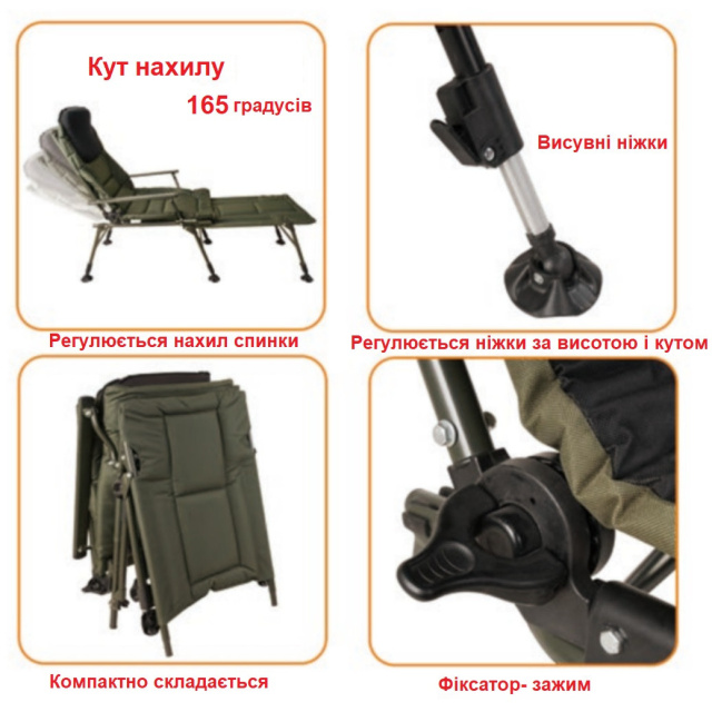 Спинка регулюється під будь-яким кутом до 165°, майже до горизонтального положення, конструкція фіксатору- зажим, швидко та легко можна змінити нахил. Завдяки тому, що конструкція крісла кріпиться болтами, можна легко зняти тканину для прання і без проблем кріпити обважування для риболовлі. При необхідності можна зняти підлокітники і відпочивати як на розкладачці, цей процес займе всього кілька хвилин.