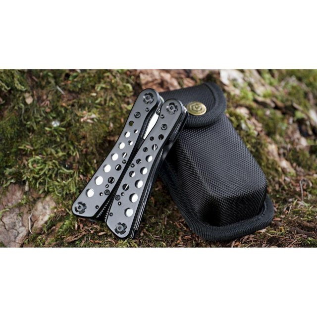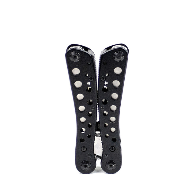 Рукоятки мультитула теж зроблені з металу і покриті чорною фарбою, що не стирається з часом. Поверхня накладок прикрашена за допомогою круглих отворів, які, одночасно, допомагають знизити вагу інструменту. Ganzo G204 переважати 253 грама.