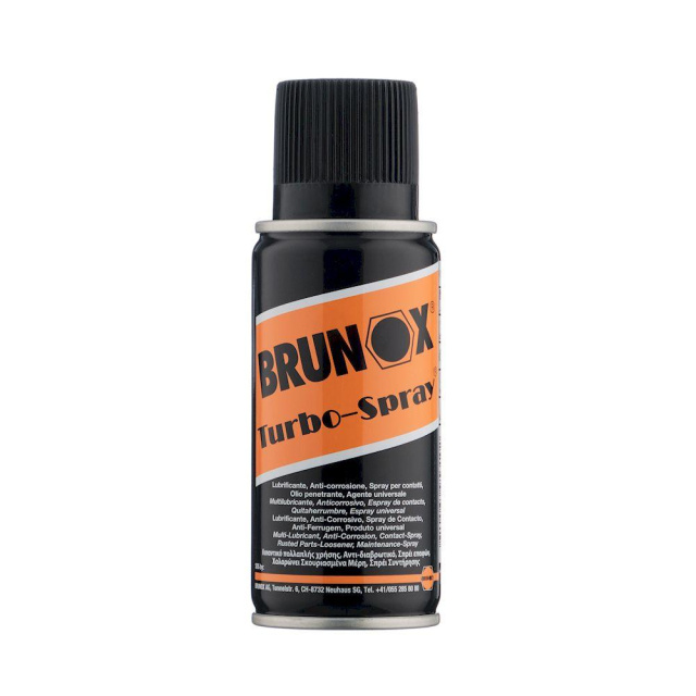 Олія Turbo-Spray – універсальний засіб від компанії Brunox, який призначений для повсякденного догляду за зброєю та її чищення. Може також застосовуватися для тимчасової консервації (захист від корозії терміном до півроку). Це мастило швидко і ефективно розпушує і розчиняє дрібні частинки металів, томпаку та пороху. З каналу ствола масло після використання видаляти не потрібно, оскільки воно створює тонку плівку для максимального захисту. Її товщина – 2 мікрони, вона не висихає і не твердне, а тому довгий час витісняє вологу та захищає механізми зброї від виникнення корозійних процесів.