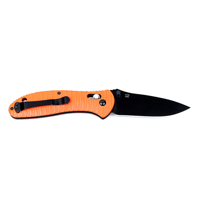 Нож должен быть практичным и красивым. Именно таким компания Ganzo сделала складень G7393Р. Лезвие в этой модели выполнен в виде drop-point и изготовлено из нержавеющей стали 440С. Данный тип стали обладает твердостью 58HRC, что делает возможным длительное время сохранять заточку. Подточить же затупляйся нож каждый пользователь может даже самостоятельно. Для гладко заточенного лезвия, как у Ganzo G7393Р, сделать это будет не сложно. Дополнительного внимания заслуживает темное покрытие клинка. Оно матовое и не отражает солнечные лучи или свет фонаря, а потому ножа подходит для охотников и использования других тактических целей. Кроме того, черное покрытие, которое сделано с помощью современных порошковых красок и не стирается со временем, выполняет роль дополнительной защиты металла от коррозии. Ну и наконец, нож с темным лезвием очень стильно смотрится.