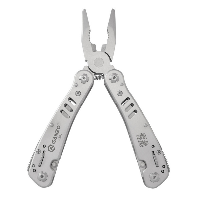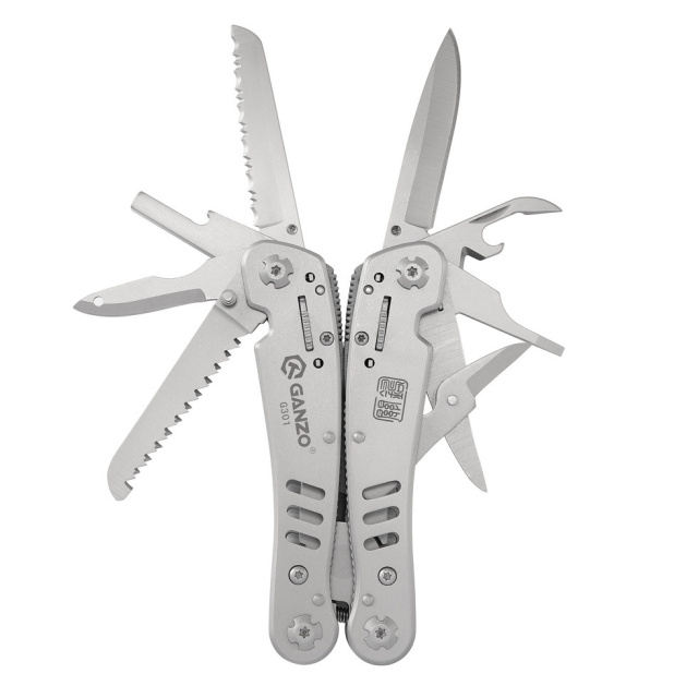 Зручний повнорозмірний мультитул G301 від компанії Ganzo. Великий набір інструментів дозволяє використовувати модель G301 для повноцінного ремонту різноманітної техніки. В комплект мультитула G301 входять наступні інструменти: підпружинені плоскогубці з кусачками, два леза, одне з яких має серейторну заточку, дві плоских викрутки різного розміру, пилу по дереву, ножиці, зенковку, подовжувач для адаптера, консервний ніж.