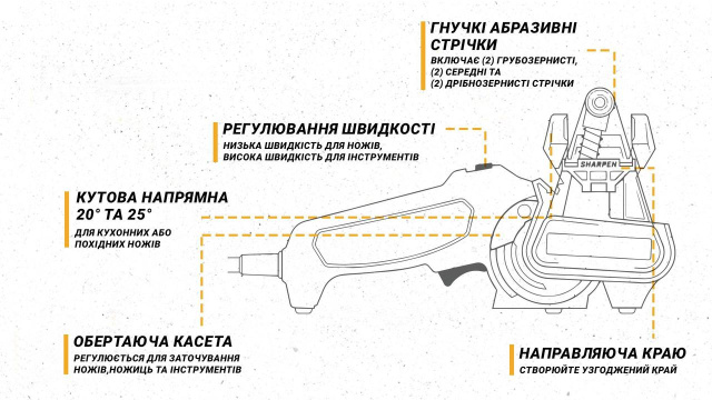 Комбинация регулировки скорости, прецизионной нарабатчивой и гибких абразивных лент позволяет править до получения волосков с высокой скоростью, легкостью и повторяемостью. Это самый быстрый и легкий способ сделать ножи настолько острыми, насколько необходимо. Больше нет смысла терпеть тупые ножи и сложные методы заточки!