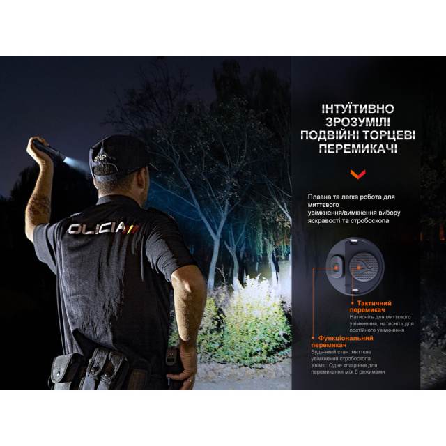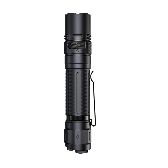 Модель относится к тактическому типу и предназначена для полицейских, военных и спасателей, которые нуждаются в качественной подсветке отдельных объектов на малых и больших дистанциях. 5 стандартных режимов работы подстраиваются под потребности пользователя, будь то ночное патрулирование, обычное освещение пространства или точечная подсветка удаленного предмета. Вспомогательный режим стробоскоп яркостью 2500 люмен предназначен для подачи сигналов на большом расстоянии и ослепления противника.