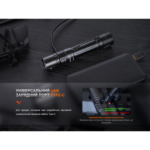 Сердцем прибора является аккумулятор Fenix ARB-L21 форм-фактора 21700 емкостью 5000 мАч, который идет в базовой комплектации. Заряд батареи можно заполнять без извлечения из батарейного отсека – для этого предназначен скрытый USB-порт Type-C. К порту подключается зарядный кабель из комплекта, с помощью которого аккумулятор заряжается за 3 часа с 0% до 100%. Процесс зарядки отслеживается за счет цветного индикатора: красный цвет – аккумулятор заряжается, зеленый – элемент питания полностью заряжен. Порт находится под силиконовой заглушкой, препятствующей попаданию засорений внутрь.