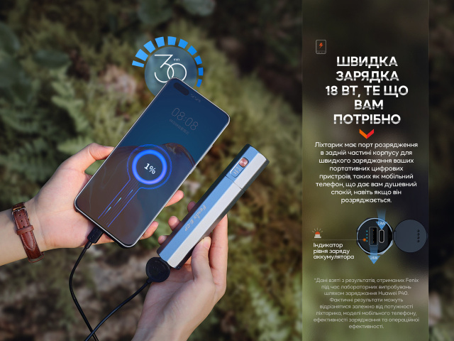 Примечание: показатели свечения модели основаны на результатах, полученных фирмой Fenix во время лабораторных опытов с применением литий-ионного аккумулятора емкостью 5000mAh при температуре 21±3°C и влажности 50% - 80%. Реальные параметры работы фонаря могут отличаться в зависимости от различных условий внешней среды и применяемого аккумулятора.
