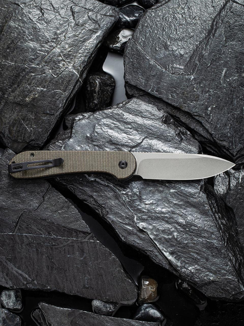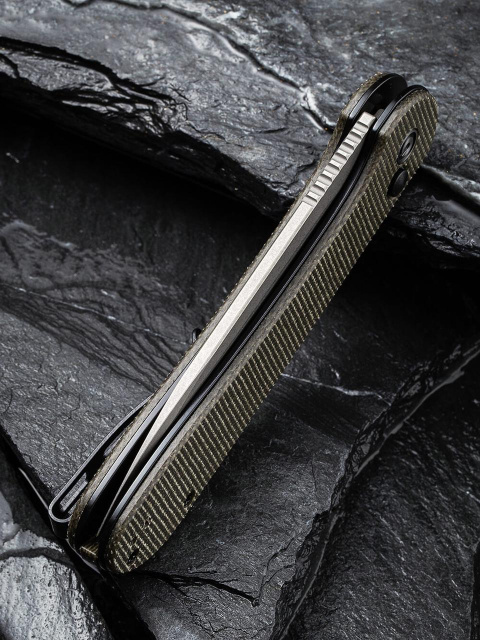 Рукоятка выполнена с применением микарты. Композитный материал из льна и синтетической смолы. Он выглядит отлично и обеспечивает достаточное сцепление. Шариковые подшипники. Длина полного ножа достигает 21,3 сантиметра, в закрытом положении длина составляет 11,5 сантиметра. Длина лезвия: 8,9 сантиметра, а толщина равна трем миллиметрам. Важить модель 95 грам.