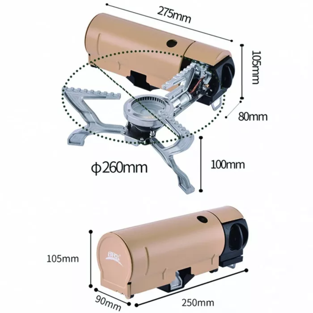 Высота газовой горелки составляет 10 сантиметров, а диаметр — 26 сантиметров, поэтому его можно использовать вместе с походной посудой разного типа и размера — от миниатюрных котелков до объемных чайников. Складные металлические стойки конфорки имеют зубчатую кромку, предотвращающую скольжение и падение посуды из горелки. Ножки горелки дополнены нейлоновыми вставками, которые обеспечивают устойчивость конструкции при использовании.