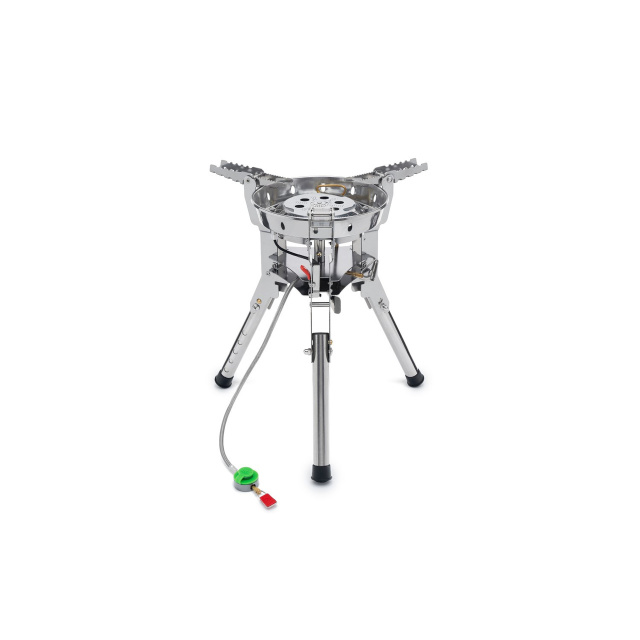 Одним из ключевых преимуществ модели является наличие складных ножек, которые имеют пять вариантов высоты. Данная особенность позволяет регулировать высоту горелки в пределах от 330 до 420 миллиметров, при этом в сложенном положении габариты модели составляют всего 210 х 205 миллиметров. Вес конструкции составляет 1.42 килограмма.