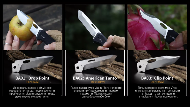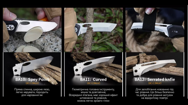 Модель относится к мультифункциональным инструментам. В базовой комплектации нож оснащен клинком с профилем Drop Point – одной из самых популярных форм в режущих инструментах повседневного и туристического назначения. Этот профиль имеет низкую к острию линию обуха и характеризуется универсальностью в эксплуатации: длинное лезвие можно применять в любых работах; требующих точного и аккуратного реза; а острый кончик подходит для колючих задач.