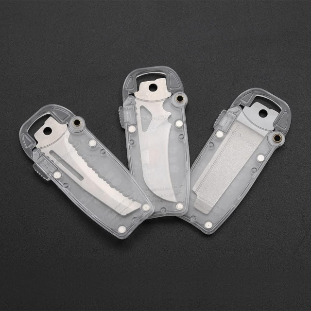 Помимо сменных клинков, в набор входят фирменные чехлы, разработанные эксклюзивно для этих аксессуаров. Чехлы изготовлены из прозрачного, износостойкого материала, что уберегает лезвия от негативного воздействия влаги и делает их ношение безопасным. В верхней части каждого чехла имеется сквозное отверстие и импровизированная петля для крепления на шлевке брюк.