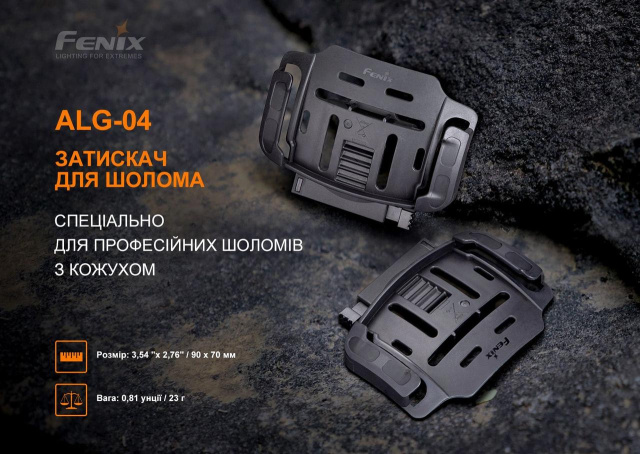 Модель совместима со множеством фирменных фонарей с серий HL, HM и HP: Fenix HL55, HL60R, HM60R, HM61R, HM65R, HM65R-T, HM70R, HP30R V2.0. Конструкция крепления позволяет регулировать направление луча света одной рукой, подстраивая освещение под индивидуальные потребности. В отличие от обычных креплений, удерживающихся на шлеме с помощью клейкой основы, ALG-04 обеспечивает более прочную фиксацию осветительного устройства благодаря плотному установке в соответствующем для этих целей слот габаритами 85 х 55 мм.