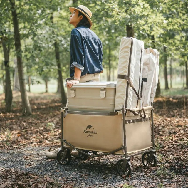 Портативный колясок Naturehike емкостью около 146 литров подходит для любителей кемпингов и пикников на природе. Благодаря продуманной конструкции модель можно использовать не только как обычную тележку, но и трансформировать в полку для хранения вещей или миниатюрный столик с полипропиленовой столешницей (приобретается отдельно).