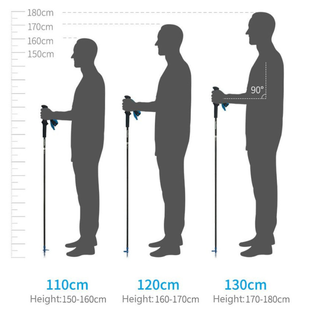 Длина палок составляет 110 см. Она является фиксированной и подходит для человека ростом 150-160 см. Стержни изготовлены из прочного, нержавеющего карбона. После использования секции разъединяются и аксессуары складываются до 36 см. Интегрированные наконечники из вольфрама не разрушаются при тертые об твердую поверхность и продлевают срок службы палок. Комплект дополняют колпачки.