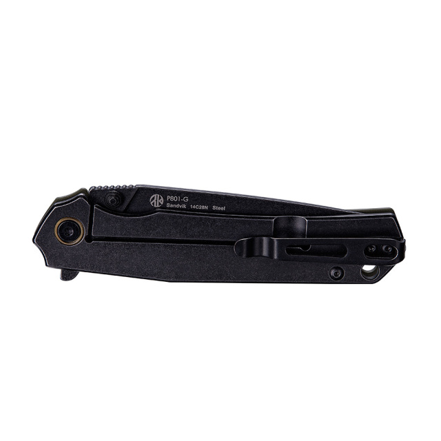 На стальной части рукоятки закреплена клипса, которая является однопозиционной. По желанию нож Ruike P801-G можно украсить темляком — для него предназначен хвостовое отверстие в рукояти.