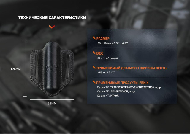 Фиксация осветительного устройства в вертикальном положении делает эксплуатацию удобной как для правшей, так и для левшей, а открытый дизайн позволяет быстро достать и использовать фонарь. Чехол подходит для крепления на ремни шириной ≤55 мм.