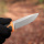 Материал клинка – углеродистая сталь 9CR14. Марка является одним из видов мартенситной стали с высокой сопротивляемостью к окислению и коррозии. Среди других преимуществ данного металла: длительное удержание остроты прямого лезвия и устойчивость к износу, благодаря чему марка повсеместно используется европейскими и американскими брендами в производстве режущих инструментов. После термообработка сталь приобретает эталонную твердость на уровне ±59 HRC, что также продлевает ее эксплуатационный срок.