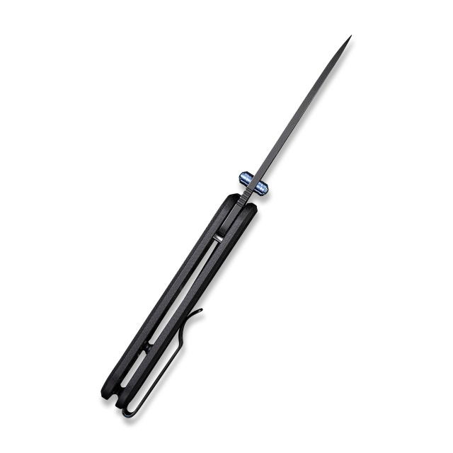 Нож Weknife Banter 2004B легко открывается как правой, так и левой рукой, поскольку шпень, закрепленный на клинке, является двусторонним. Этот элемент изготовлен из титана 6AL4V с синим покрытием, что служит украшением дизайна. Фиксация лезвия осуществляется замком liner lock.