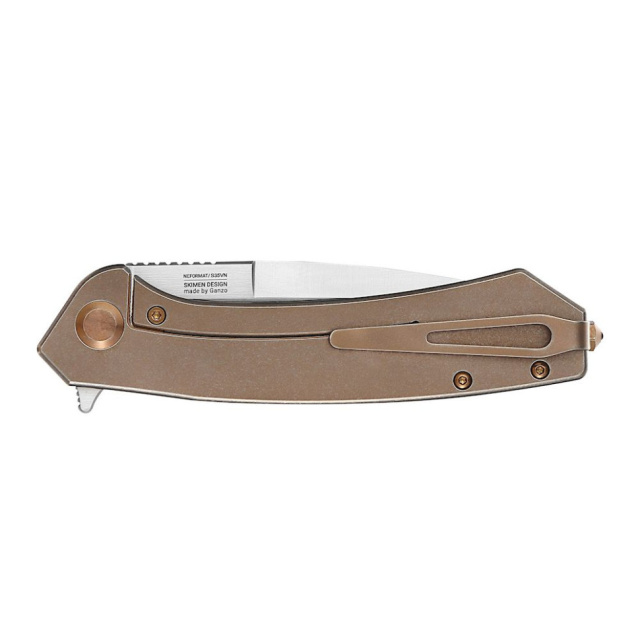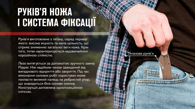 Материал рукоятки - титан с покрытием коричневого оттенка. Среди преимуществ титана: высокая удельная прочность и малая плотность, что способствует снижению общего веса ножа до 92.3 г против 120 г у базовых моделей.