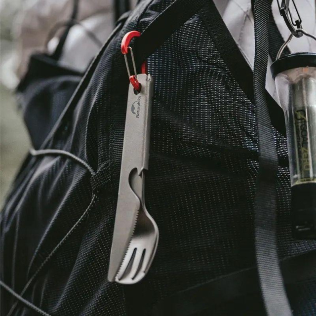 Набор столовых приборов Naturehike CNH22CJ017, состоящий из вилки, ножа и ложки. Все изделия имеют компактные габариты и небольшой вес, поэтому их удобно брать с собой в путешествия или туристические походы. Изготовлены они из прочного и долговечного титана. Этот материал на протяжении многих лет сохраняет свои первоначальные характеристики. Он не подвержен коррозии, а также не вступает в взаимодействие с пищей, поэтому не передает ей металлический привкус. Изделия имеют лаконичный и привлекательный дизайн. В ноже есть встроенная открывалка для бутылок, что делает его еще более функциональным. Также в нем есть встроенные бортики, в которые можно сложить ложку и вилку, чтобы хранить все приборы в одном месте. При необходимости изделия можно повесить на карабин, но покупать его нужно отдельно, так как он в комплекте отсутствует. Для удобства хранения и транспортировки производитель предусмотрел тканевый мешочек. Он продается вместе с приборами.