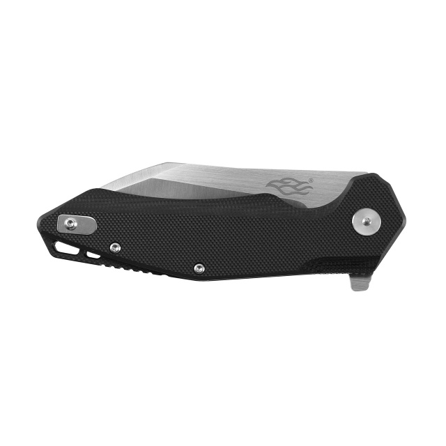 Длина клинка вполне достаточна, чтобы с его помощью было удобно выполнять все основные виды работ. Она составляет 86 мм. При этом большую прочность лезвия гарантирует толщина по обуху, ровная 3 мм. Форма клинка необычная для бренда Firebird - это Wharncliffe. Для такой формы характерна абсолютно прямая режущая кромка, наличие фальшлеза на обухе, а также остро заточенный кончик лезвия. Также необходимо сказать, что поверхность ножа отшлифована методом сатинирования, за счет чего поверхность стали напоминать атлас, на котором видно множество еле заметных чертиков. Такие ножи меньше бликают, а небольшие царапины на их поверхности остаются незаметными.