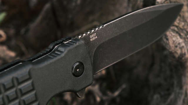Клинок изготовлен из стали 8CR14 с черным покрытием. Металл демонстрирует высокую сопротивляемость к коррозии, поэтому не требует специального ухода. Твердость марки находится на уровне ±58 HRC, выдерживая баланс между прочностью и легкостью в заточке, которое можно выполнить в домашних условиях с использованием обычных абразивов.