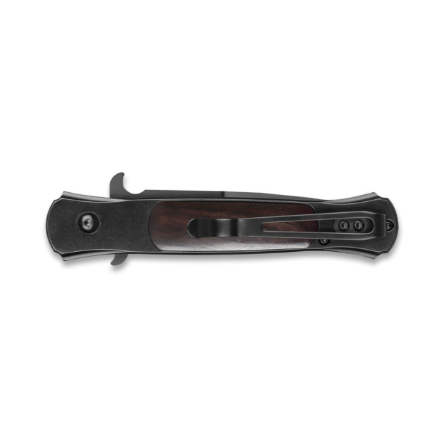 Клинок и рукоять имеют черное покрытие, которое не только украшает дизайн, но также матирует отпечатки пальцев и укрепляет металл. Клипса, закрепленная на рукояти с помощью двух винтов, обеспечивает надежное крепление инструмента к поясу или карману одежды.