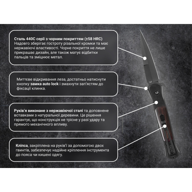 клинок из нержавеющей стали 440С, закаленной до ±58 HRC;