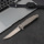 В экземпляре применяется сталь марки 154СМ. Особенность такой стали – в высоком содержимом углерода, изначально она была создана для лопаток газовых турбин. Это очень популярный и качественный ножевой материал. Металлический сплав прошел через криогенную обработку, и обладает устойчивостью к коррозии. Твердость клинка достигает 58-60 единиц по шкале Роквелла. Это достаточно высокий показатель, как для такого типа инструментов. Вес модели составляет 110 грамм, толщина клинка – чуть больше 3 миллиметров. Общая длина изделия – 21 сантиметр. Легкая флипировка достигается за счет наличия шайбы с подшипниками. Достаточно простого нажатия на одностороннюю «гарду» с противоскользящими насечками, выступающую из рукоятки в сложенном состоянии. Обух имеет скос на полную длину, сходится со спусками в ребре к кончику лезвия. Поверхность клинка прошла через дробоструминную отделку.
