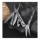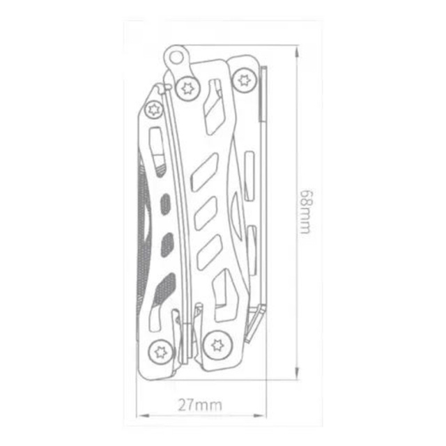 Модель оснащена плоскогубцами с тонкими губками, которые подходят для работы с мягкой проволокой и гайками размером < M6. Также есть ножницы с пружинным механизмом, напильник, нож с прямым лезвием, открывашки для банок и бутылок, шлицевая и крестовая отвертки.