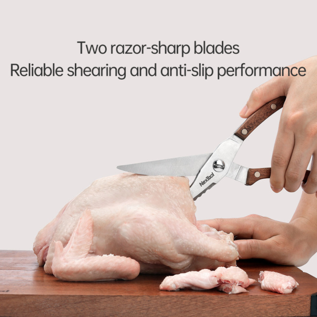 Ножницы с двойным лезвием. Острые мелкозубчатые лезвия из прочной стали 30Cr14 равномерно распределяют усилия при резке и предотвращают соскальзывание. Ножницы легко справляются даже с плотными продуктами, такими как мясо и хрящи.