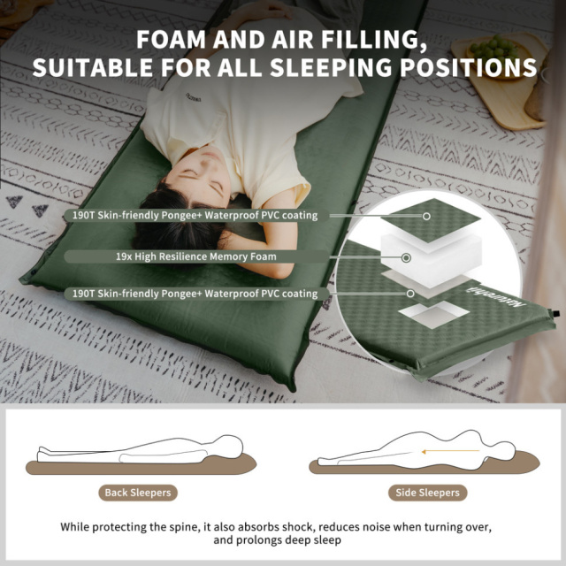 Верхний слой изготовлен из гладкого эпонжа 190T с пенным наполнителем. Ключевое преимущество коврика – ортопедические свойства, благодаря которым он равномерно распределяет вес тела, поддерживая позвоночник в правильном положении и снижая нагрузку на суставы и мышцы во время сна.