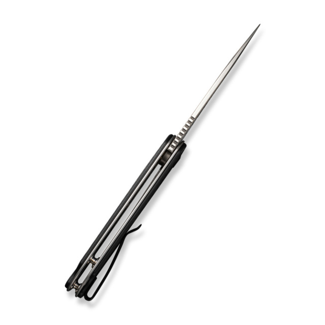 Плавное открывание клинка обеспечивается благодаря керамическим шариковщикам в основе конструкции. Чтобы открыть лезвие к фиксации, достаточно нажать на плавник из нержавеющей стали. Нож открывается с характерным щелчком, что указывает на готовность инструмента к работе. В качестве запорного механизма используется замок Liner Lock.