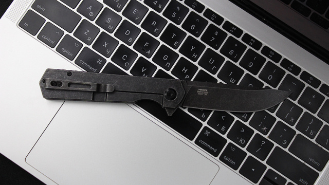 Для рукоятки виробники також вирішили використовувати метал. Проте для цієї деталі була обрана більш стійка до впливу води нержавіюча сталь. Форма ручки дуже проста, без будь-яких надмірностей у дизайні. Але оригінальність їй забезпечує така ж фінішна обробка, як і у леза ножа. А для зручності користувачів, до рукоятки прикручена невелика сталева кліпса, що дозволяє зафіксувати інструмент в кишені або на поясі.