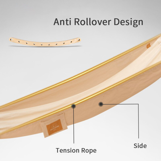 Гамак NH20DC001 від Naturehike має просту та зносостійку конструкцію, що витримує навантаження до 100 кг. Однією з особливостей моделі є траверси з деревини ясеня, які мають вигнуту форму для запобігання випадковому перекиданню виробу під час використання.