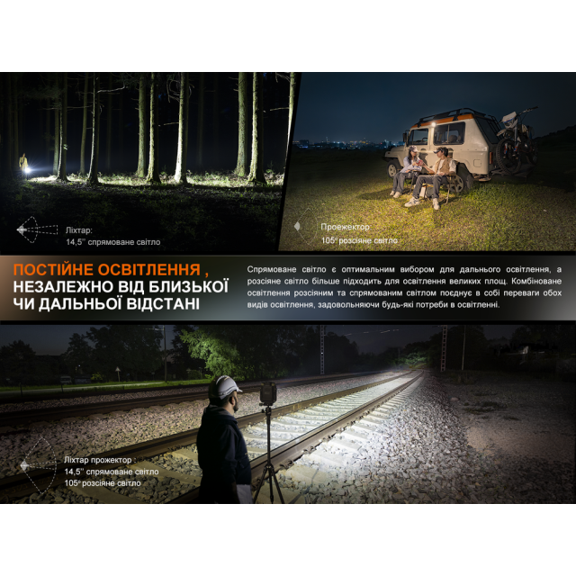 Фонарь работает на базе светодиода Luminus SST20 и вспомогательного трехцветного диода COB – оба со сроком службы не менее 50000 ч, что гарантирует долговечность работы устройства. Угол луча зависит от типа выбранного режима: в ближнем освещении он составляет 105°, в дальнобойном — 14.5° с боковым освещением 85°, а в комбинированном — 14.5° с засветкой 105°.