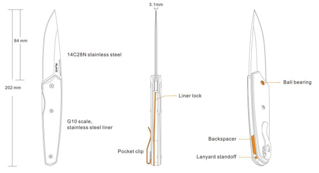 Відкривається ніж за допомогою спеціальної виїмки на клинку. За рахунок наявності підшипників, дістати лезо не складе труднощів навіть тому хто вперше тримає Ruike P848-B в руках. Для його виготовлення використовується високоякісна нержавіюча сталь з маркуванням 14C28N, загартована до рівня 58-60 HRC, що дозволяє лезу залишатися міцним в будь-яких умовах і досить довго зберігати гостроту ріжучої кромки.