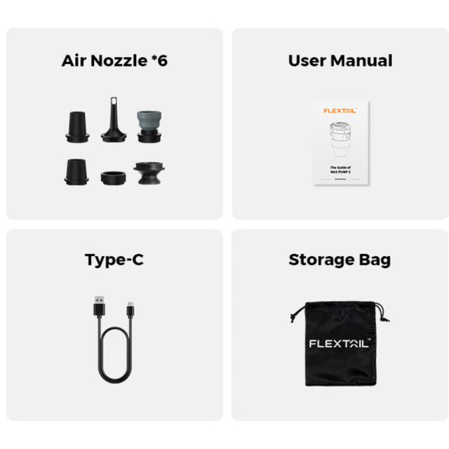 Насос-фонарь Flextail Max Pump 3, зарядный кабель USB-C, 6 насадок, мешочек для хранения, инструкция пользователя.