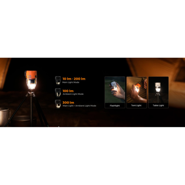 Светодиодный фонарь. Интерфейс представлен 3 вариантами света: 100 лм – 11 ч, 200 лм – 5 ч, 300 лм – 4 ч. Прозрачная часть корпуса увеличивает радиус освещения для подсветки максимальной площади, а разнообразие вариантов эксплуатации повышает функциональность модели. Вы можете использовать ее как ручной фонарик, устанавливать на ровной поверхности, крепить на штативе с помощью резьбового соединения или подвешивать на крючок, адаптируя свет под текущие потребности.