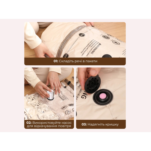 Для создания стойкого эффекта вакуума рекомендуется использовать пакеты вместе с электрическим насосом Flextail (не входит в комплект). Этот способ является быстрее ручного и позволяет уменьшить объем запакованных вещей до 80%.